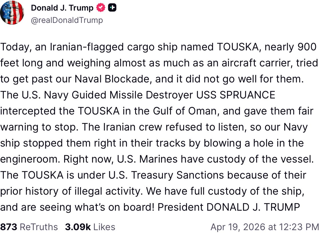 On Sunday, one of our guided missile destroyers blew a giant hole in the side of an Iranian cargo ship named “TOUSKA”…